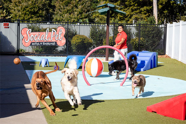At Social Pet, we want your pup to be as comfortable in our Dog Lodging program as they are in your home. Our modern facilities include outdoor play areas with ample shade, UV filtration in our HVAC system to continually scrub the air of germs, and accommodations created specifically for your pet’s comfort. When your dog isn't busy playing or being spoiled by our team, they will rest comfortably in our vacation-style accommodations. You can pick exactly what your pup will prefer with one of our multiple Dog Lodging packages and lodging options!